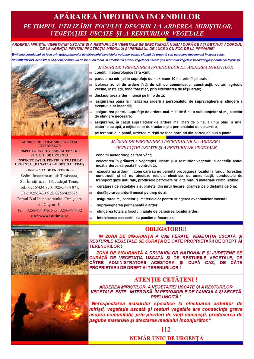 Având în vedere numărul însemnat al situaţiilor de urgenţă înregistrate în ultimii ani, cauzate de arderile necontrolate produse la mirişti, vegetaţie uscată de pe păşuni şi terenuri agricole, urmare a practicii cetăţenilor de igienizare a acestor suprafeţe agricole, precum şi consecinţele acestor acţiuni, materializate în distrugeri ale culturilor agricole din vecinătăţi, perturbări ale traficului rutier şi feroviar, incendii la gospodăriile cetăţeneşti şi anexe, în scopul evitării producerii unor evenimente similare, precum şi al asigurării condiţiilor necesare asigurării operative a intervenţiilor Primăria vă prezintă în ataşament măsurile preventive ce trebuiesc respectate.
