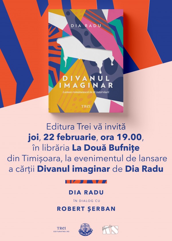 Joi, 22 februarie 2018, ora 19.00, la librăria La Două Bufnițe din Timișoara (Piața Unirii nr. 11), are loc evenimentul de lansare a cărții „Divanul imaginar. Lumea Românească în 18 interviuri” de Dia Radu, apărut la editura Trei. Invitat, alături de autoare este scriitorul și jurnalistul cultural Robert Șerban.