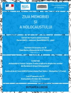 27 ianuarie, aniversarea eliberării lagărului de concentrare de la Auschwitz, a devenit „Ziua europeană a Holocaustului şi a prevenţiei crimelor împotriva umanităţii”. Institutul francez, Muzeul de Artă şi Comunitatea Evreilor din Timișoara au plăcerea de a vă invita la evenimentele dedicate comemorării acestei zile.