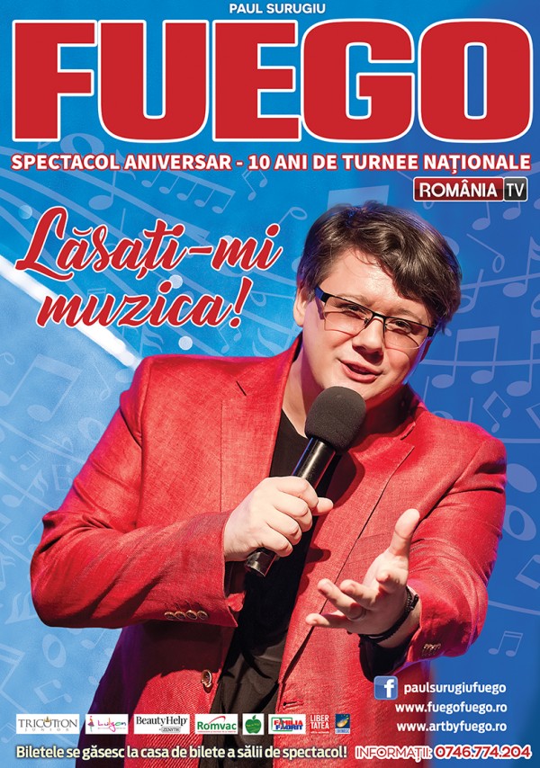 Pentru a celebra 10 ani de turnee naționale, Fuego străbate din nou țara, iar Timișoara se află pe itinerariul său aniversar, ce cuprinde 20 de orașe. Concertul intitulat ”Lăsați-mi muzica!” se va desfășura marți, 28 martie, de la ora 20, în sala Capitol a Filarmonicii Banatul. În cadrul acestui eveniment se va lansa un nou material discografic, ”un musical-audio spectaculos, realizat împreună cu compozitorul și dirijorul Zsolt Kerestely. Programul serii va cuprinde piese noi, dar și șlagăre în versiuni noi, alcătuind împreună un univers melodios, plin de culoare și sensibilitate, în care fiecare spectator se va regăsi”, promit organizatorii.