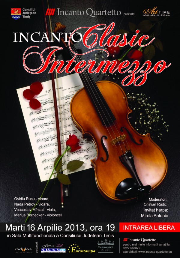 Accesul publicului la concert este liber. „Intermezzo înseamnă în sens lărgit o trecere, o punte între două evenimente scenice. Şi dacă viaţa e o scenă şi noi chiar suntem actorii ei, Incanto Quartetto îşi propune să ne înlesnească trecerile de la un sentiment la altul, de la un gând la altul, de la o stare la alta, prin intermediul limbajului care nu are nevoie de traducere.