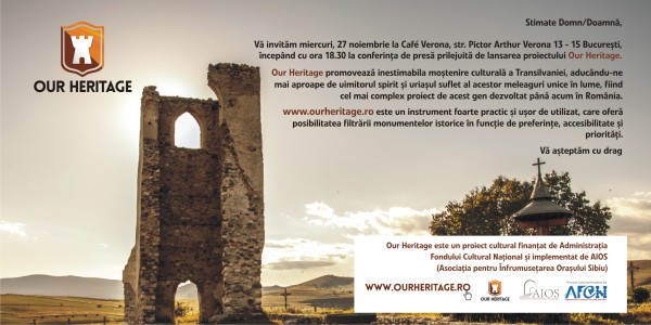 Miercuri, 27 noiembrie, ora 18.30 la Café Verona (strada Pictor Arthur Verona 13 – 15, Bucuresti) va avea loc evenimentul de lansare a proiectului OurHeritage Our Heritage este cea mai completa sursa de informatii despre monumentele istorice ale Transilvaniei si cel mai complex proiect de acest gen dezvoltat pana acum in Romania. Finantat de Administratia Fondului Cultural National si implementat de AIOS, OurHeritage are misiunea de identificare si cartare a patrimoniului cultural transilvănean, in scopul conservarii durabile a monumentelor istorice.