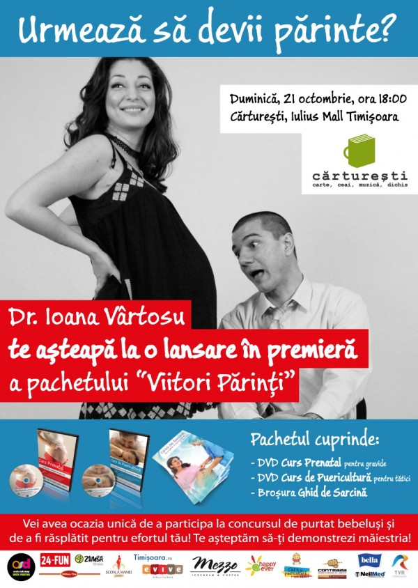 Duminică, 21 octombrie, ora 18:00, invităm părinţii şi viitorii părinţi să-şi dea întâlnire în librăria Cărtureşti din Iulius Mall, cu ocazia lansării pachetului „Viitori Părinţi”, semnat doctor Ioana Vârtosu.
