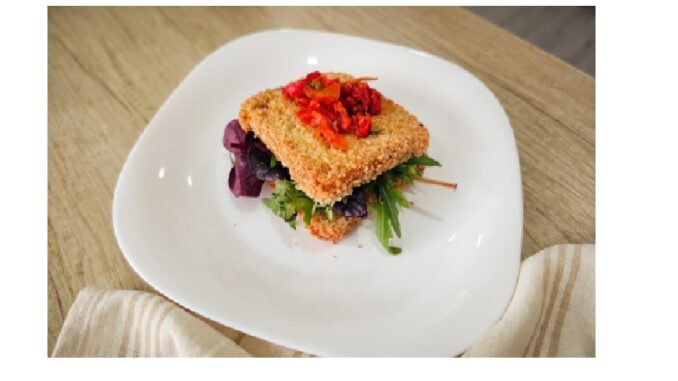 Mod de preparare: „Construiesc sandwich-ul. Pun mozzarella, șuncă (sau doar legume, dacă vreau varianta vegetariană), ardei copți și puțină salată între două felii de pâine toast. Apoi îl trec printr-un proces în 3 pași, ca să obțin crusta aceea crocantă: Mai întâi îl dau prin făină, apoi prin ou bătut, iar la final prin pesmet. Îl pun într-o tigaie cu ulei încins și îl prăjesc pe fiecare parte până devine auriu și crocant. În interior, mozzarella se topește și leagă toate ingredientele, iar exteriorul capătă textura aia care face diferența.” (reţetă Adi Hădean)