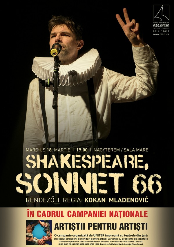 Astfel, puteţi oferi ajutor cumpărând bilete la reprezentaţia din 18 martie a „Shakespeare, Sonnet 66”, regizat de Kokan Mladenovic, în interpretarea trupei Teatrului Maghiar de Stat Csiky Gergely Timişoara. Spectacolul „Shakespeare, Sonnet 66” este bazat pe mişcare şi muzică şi deconstruieşte fiecare vers al Sonetului 66 de W. Shakespeare, abordând cele mai importante subiecte din actualitate: terorismul, criza refugiaţilor, războaiele, cenzura în artă, limitarea libertăţii de exprimare etc. Din distribuţie fac parte: Aszalos Géza, Balázs Attila, Bandi András Zsolt, Borbély B. Emília, Csata Zsolt, Éder Enikő, Horváth Anna, Kiss Attila, Kocsárdi Levente, Lőrincz Rita, Magyari Etelka, Mátrai Lukács Sándor, Mátyás Zsolt Imre, Molnár Bence, Molnos András Csaba, Simó Emese, Tar Mónika şi Tokai Andrea.