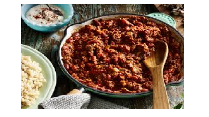 Ingrediente: Pentru 6 persoane: 900 g de fasole roșie cu boabe mari, fiartă sau din conservă (se pot folosi și boabe mari de fasole colorată), 450 g de roșii fierte sau din conservă, 450 g de carne de vânat sau carne de vacă tocată, 1 ceapă mică tăiată mărunt, 100 g de ardei iute proaspăt, pisat, 1 linguriță de chimen, 2 lingură de oregano, 1 linguriță de piper negru, 80 ml de ulei de floarea-soarelui, sare, după gust.