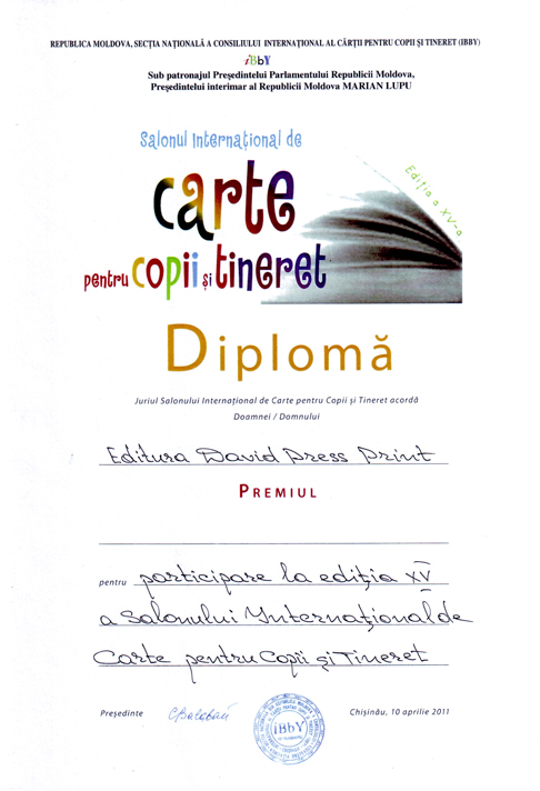 La acest eveniment, a participat și David Press Print din Timișoara, fiind reprezentată de domnul conf. univ. dr. Ioan David, directorul editurii. Lansarea celor două volume de autori copii: Ridică-te Pasăre Phoenix! (Florina-Adriana Secoșan) și Ecouri de speranță (Hedir Al-Chalabi) au fost completate de alte trei cărți scrise de adulți, dar, tot pentru copii: Aventurile lui Bobby (Vlad-Marian Ștef), Lumea lui Piticel (Violeta Secoșan) și Lăbuș și cărăbuș (Mihai Țopa) și a avut loc la Moldexpo, Pavilionul 3. Tot în cadrul acestui eveniment, dar la Biblioteca Publică „Onisifor Ghibu” din Chișinău, având ca și moderator pe doamna Elena Vulpe, director al acesteia, au fost lansate volumele inedite Le Banat (Timishana) – Banatul (Timișean) (Traian Vuia), Tabla de la Lugoj (Valeriu Braniște), Algonauții. The Algonauts (Crișu Dascălu), Arta de a scrie, Arta de a citi – eseuri critice (Doina Bogdan-Dascălu), Între cer și pământ (Violeta Secoșan-Cadar), Istanbul, un oraș pe două continente (Radu Igna) și, nu în ultimul rând, Pe un an, un ban. Pe lună, o prună – Dimitrie Comșa și apropiații săi (Vali Corduneanu). Prezentarea acestora a fost susținută de prof. univ. dr. Adrian Dinu Rachieru, referent științific al editurii și conf. univ. dr. Ioan David, directorul editurii.