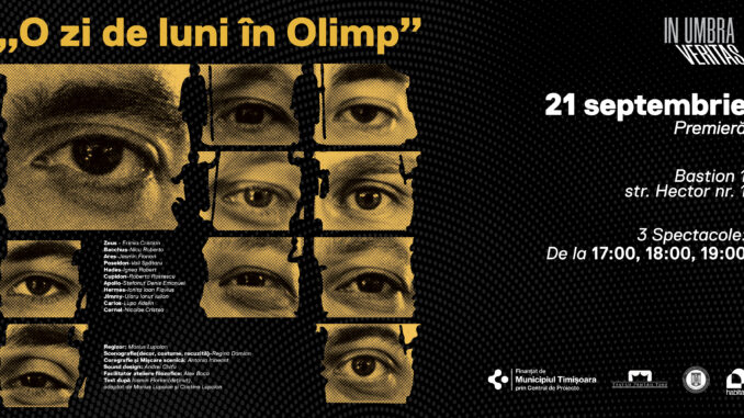O zi de luni în Olimp face parte din proiectul In Umbra Veritas, implementat de Asociația Teatru pentru Tine, finanțat de și realizat în parteneriat cu Municipiul Timișoara prin @centruldeproiecte prin Fondul pentru Nevoi Culturale de Urgență și programul Spații pentru comunitate.